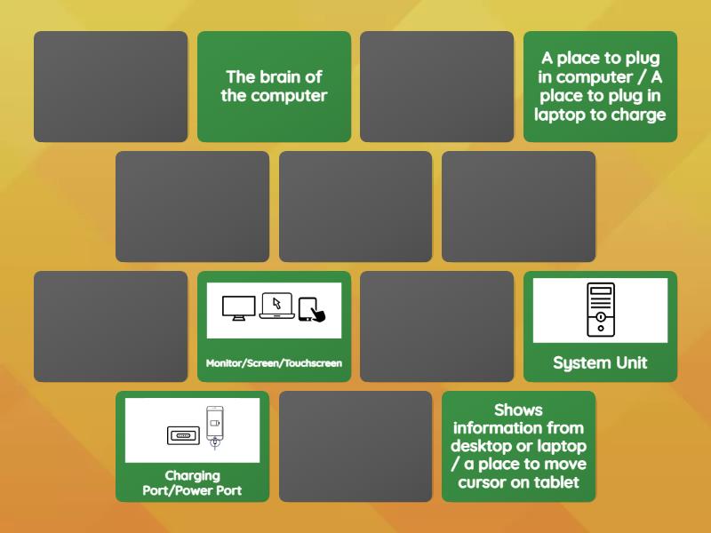 Charging Port/Power Port - A place to plug in computer / A place to plug in laptop to charge, Monitor/Screen/Touchscreen - Shows information from desktop or laptop / a place to move cursor on tablet, System Unit - The brain of the computer, Mouse/Touchpad - Allows movement of cursor / A place to move cursor on laptop, Keyboard - A place to type on computer, Home Button - Brings user to home screen, Power Button - Allows computer to turn on,