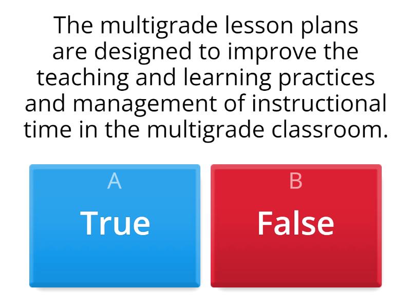 1) The multigrade lesson plans are designed to improve the teaching and learning practices and management of instructional time in the multigrade classroom. a) True b) False 2) Letter icons or symbols are included in the lesson plan to prompt the teacher when to move from one grade to another. a) True b) False 3) The icons are placed on the LEFT side of each column to signal the flow of the teacher's movement from the start of the lesson plan to the end. a) True b) False 4) There are activities in the lesson plan that need the assistance of a pupil-leader. a) True b) False 5) The letter T in the TGIA symbols is interpreted as "Direct Teaching" with the whole class or grade level. a) True b) False 6) The letter G symbolizes children doing individual or independent activity with minimal supervision of the teacher. a) True b) False 7) The letter I means "Group Activity" that is given to the class/grade with less monitoring and supervision of the teacher. a) True b) False 8) Letter A means the whole/ grade is doing an assessment activity. a) True b) False 9) In the absence of a competency in Grade 1, the pupils are given activities parallel to their grade level competencies to keep up with the time while the teacher is directly teaching in another grade level. a) True b) False 10) Assessment of performance is more valid and reliable if pupils are involved in evaluating their work using rubrics. a) True b) False