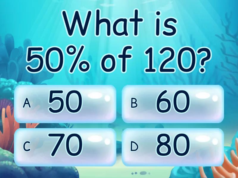 1) What is 50% of 120? a) 50 b) 60 c) 70 d) 80 2) What is 50% of 2.4? a) 1.2 b) 1.3 c) 1.4 d) 1.5 3) What is 25% of 12? a) 1 b) 2 c) 3 d) 4 4) What is 25% of 40 a) 40 b) 30 c) 20 d) 10 5) What is 10% of 700? a) 90 b) 80 c) 70 d) 60 6) What is 10% of 200 a) 10 b) 20 c) 30 d) 40 7) What is 5% of 70? a) 25 b) 35 c) 45 d) 55 8) What is 20% of 70? a) 140 b) 150 c) 160 d) 170 9) What is 20% of 16? a) 3.4 b) 3.3 c) 3.2 d) 3.1 10) What is 20% of 8? a) 1.0 b) 1.2 c) 1.4 d) 1.6