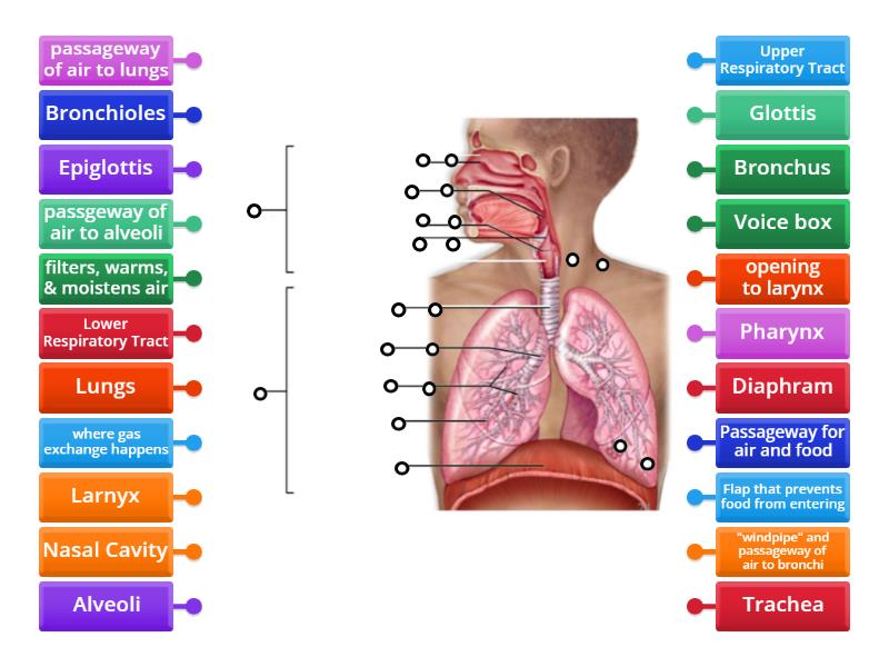 Upper Respiratory Tract, Lower Respiratory Tract, Nasal Cavity, filters, warms, & moistens air, Pharynx, Passageway for air and food, Glottis, opening to larynx, Epiglottis, Flap that prevents food from entering, Trachea, "windpipe" and passageway of air to bronchi, Bronchus, passageway of air to lungs, Bronchioles, passgeway of air to alveoli, Lungs, Alveoli, where gas exchange happens, Diaphram, Larnyx, Voice box.