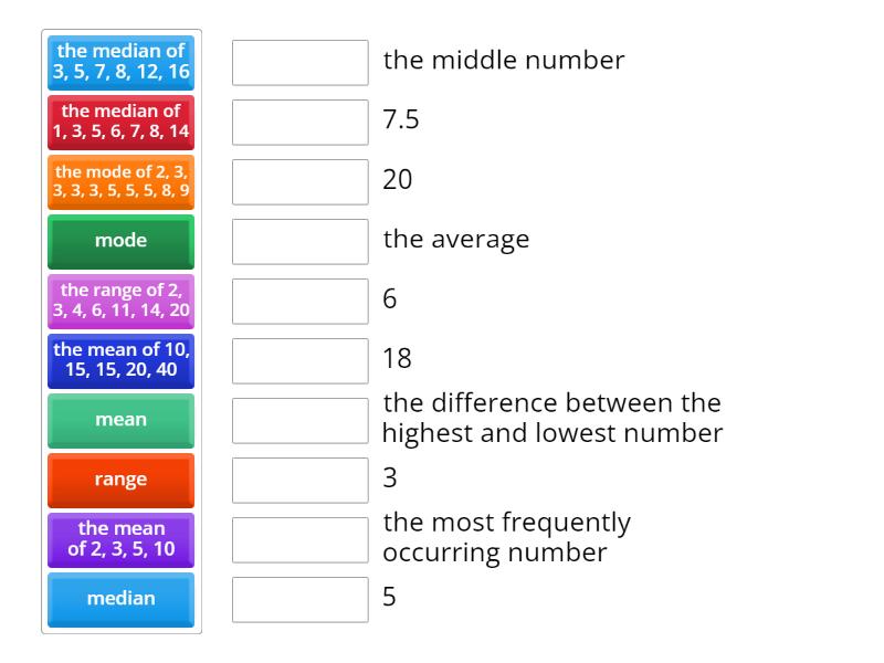 mean - the average, median - the middle number, mode - the most frequently occurring number, range - the difference between the highest and lowest number, the mode of 2, 3, 3, 3, 3, 5, 5, 5, 8, 9 - 3, the mean of 2, 3, 5, 10 - 5, the median of 1, 3, 5, 6, 7, 8, 14 - 6, the median of 3, 5, 7, 8, 12, 16 - 7.5, the range of 2, 3, 4, 6, 11, 14, 20 - 18, the mean of 10, 15, 15, 20, 40 - 20,