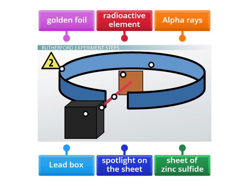 Lead box, radioactive element , Alpha rays, sheet of zinc sulfide , golden foil , spotlight on the sheet .