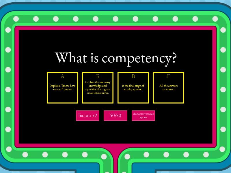 1) What is competency? a) Implies a “know-how – to act” process b) involves the necessary knowledge and capacities that a given situation requires. c) is the final stage of a cycle; a period. d) All the answers are correct 2) Competence is not a simple addition of knowledge, skills and ___________________ a) relation b) attitude c) communication d) methodology 3) Relevance of the competency-based approach: a) changing the function of the state in education: from total control and planning – to general legal regulation of relations arising in education; b) an interconnection of one research topic with others c) describes how efficient the outcome of the project is expected to be with respect to a given goal, to be specified by the evaluation or by the project being submitted. d) s critical in areas like public policy, socio-economic research, and market segmentation 4) The basic distinguishing features of “competency-based education” have also been identified: a) n activity which required learners to arrive at an outcome from given information through some process of thought, and which allowed teachers to control and regulate that process, was regarded as a “Task”. b) Involves a primary focus on (pragmatic) meaning. c) It has some kind of gap: information, reasoning or opinion gap. d) personality-centered education, ensuring the possibility of selectivity of courses according to interests; 5) the competence means ability to mobilize the gained knowledge, abilities, experience and ways of behavior in the conditions of a concrete situation, concrete activity. IS IT TRUE? a) yes b) no 6) Choose cross-cultural and communicative competences. a) Social subcompetence b) Conceptual subcompetence c) Linguo-cultural subcompetence d) All the answers are correct 7) Who does this sentence refer to?: «Competence» of the person is acmeological category and potential of intellectual and professional personal development characteristic of which are «competences» which have to be created in the course of education as system quality new growths a) American pedagogics b) A.V.Khutorskoy c) D.N.Kulibayeva d) Sh.U.Tasbulatova 8) Considering various key competences as ability, readiness for a certain activity can be marked out their invariant components or aspects. It is possible to carry to their number: a) readiness for goal-setting; b) readiness for plan c) readiness for task d) readiness for approach 9) In Kazakhstan in the course of foreign language teaching it is possible to use the following competency-based technologies: a) Project based learning b) Task based learning c) Grammar translation method d) Direct method 10) an instructional objective described in task-based terms that include a verb describing a demonstrable skill such as answer, interpret, or request.Example: "Students will be able to ..." a) method b) approach c) Competency d) communication