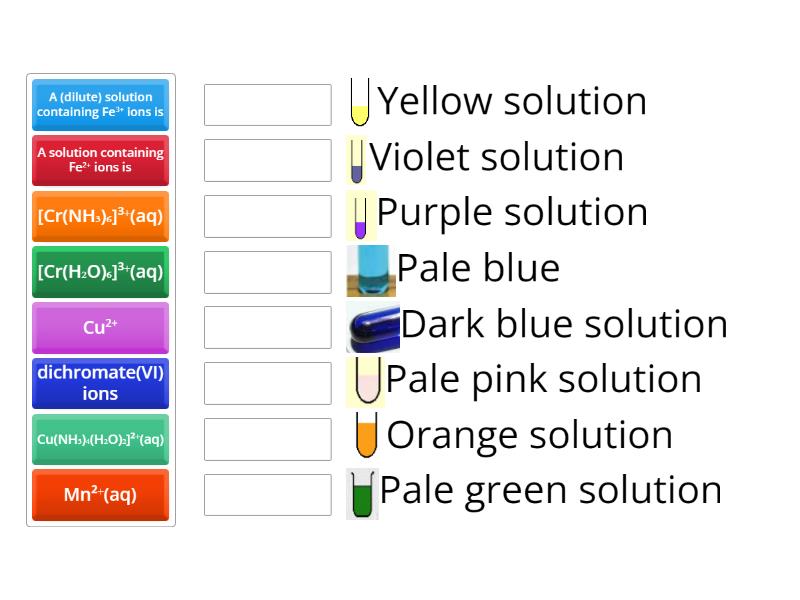 A solution containing Fe2+ ions is - Pale green solution, A (dilute) solution containing Fe3+ ions is - Yellow solution, dichromate(VI) ions - Orange solution, Cu(NH₃)₄(H₂O)₂]²⁺(aq) - Dark blue solution, [Cr(NH₃)₆]³⁺(aq) - Purple solution, [Cr(H₂O)₆]³⁺(aq) - Violet solution, Mn²⁺(aq) - Pale pink solution, Cu2+ - Pale blue,