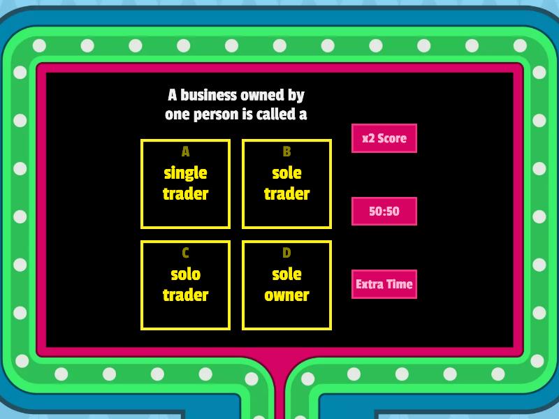 1) A business owned by one person is called a a) single trader b) sole trader c) solo trader d) sole owner 2) a partnership can have 2+ partners a) true b) false 3) which of these is not a source of finance for partnerships a) bank loan b) bank overdraft c) share investment d) personal savings 4) Sole traders are the only business that would provide a good or service a) true b) false 5) Partners can be forced to sell their personal posessions a) true b) false 6) Sole traders always work alone with no other staff a) true b) false 7) partners must always share everything equally a) true b) false 8) Partnerships need to be 2-20 people with very different skills a) true b) false 9) It can be hard to take holidays if you are a a) boss b) sole trader c) owner d) partner