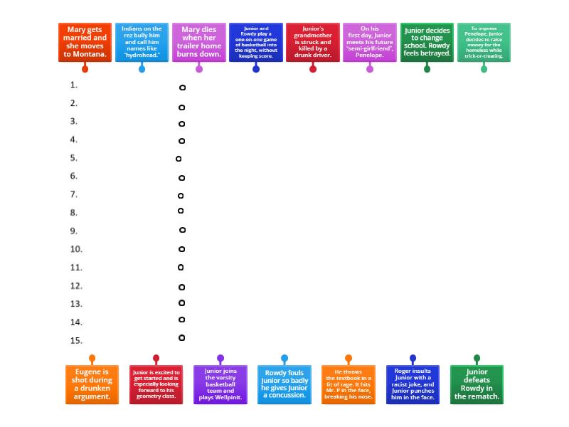 Indians on the rez bully him and call him names like “hydrohead.”, Junior is excited to get started and is especially looking forward to his geometry class., He throws the textbook in a fit of rage. It hits Mr. P in the face, breaking his nose., Junior decides to change school. Rowdy feels betrayed., On his first day, Junior meets his future “semi-girlfriend”, Penelope., Roger insults Junior with a racist joke, and Junior punches him in the face., To impress Penelope, Junior decides to raise money for the homeless while trick-or-treating., Mary gets married and she moves to Montana., Junior joins the varsity basketball team and plays Wellpinit., Rowdy fouls Junior so badly he gives Junior a concussion., Junior’s grandmother is struck and killed by a drunk driver., Eugene is shot during a drunken argument., Junior defeats Rowdy in the rematch., Mary dies when her trailer home burns down., Junior and Rowdy play a one-on-one game of basketball into the night, without keeping score..