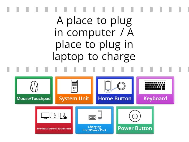 Charging Port/Power Port - A place to plug in computer / A place to plug in laptop to charge, Monitor/Screen/Touchscreen - Shows information from desktop or laptop / a place to move cursor on tablet, System Unit - The brain of the computer, Mouse/Touchpad - Allows movement of cursor / A place to move cursor on laptop, Keyboard - A place to type on computer, Home Button - Brings user to home screen, Power Button - Allows computer to turn on,