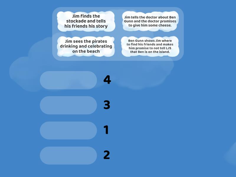 Ben Gunn shows Jim where to find his friends and makes him promise to not tell LJS that Ben is on the island. - 1, Jim sees the pirates drinking and celebrating on the beach - 2, Jim finds the stockade and tells his friends his story - 3, Jim tells the doctor about Ben Gunn and the doctor promises to give him some cheese. - 4,