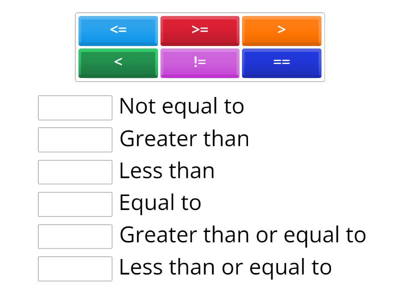 > - Greater than, < - Less than, >= - Greater than or equal to, <= - Less than or equal to, == - Equal to, != - Not equal to,