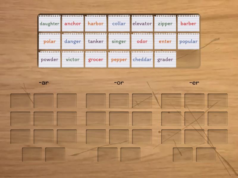 -ar: polar, collar, cheddar, popular, -or: odor, harbor, anchor, elevator, victor, -er: grocer, pepper, barber, grader, tanker, singer, enter, zipper, powder, danger, daughter,
