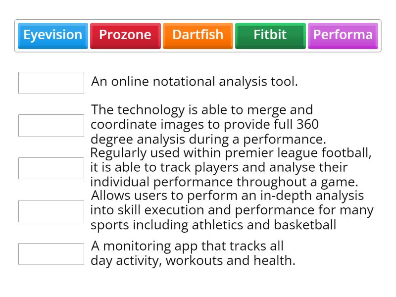 Dartfish - Allows users to perform an in-depth analysis into skill execution and performance for many sports including athletics and basketball, Performa - An online notational analysis tool., Fitbit - A monitoring app that tracks all day activity, workouts and health., Prozone - Regularly used within premier league football, it is able to track players and analyse their individual performance throughout a game., Eyevision - The technology is able to merge and coordinate images to provide full 360 degree analysis during a performance.,