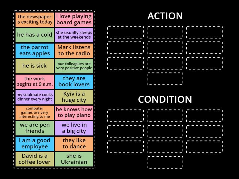 ACTION: they like to dance, we live in a big city, I love playing board games, the parrot eats apples, Mark listens to the radio, she usually sleeps at the weekends, he knows how to play piano, the work begins at 9 a.m., he has a cold, my soulmate cooks dinner every night, CONDITION: they are book lovers, Kyiv is a huge city, computer games are very interesting to me, she is Ukrainian, we are pen friends , our colleagues are very positive people, David is a coffee lover, he is sick, the newspaper is exciting today, I am a good employee,