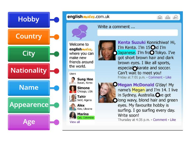 Name, Nationality, Country, City, Age, Hobby, Appearence.