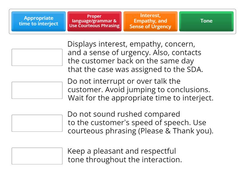 Proper language/grammar & Use Courteous Phrasing - Do not sound rushed compared to the customer’s speed of speech. Use courteous phrasing (Please & Thank you)., Interest, Empathy, and Sense of Urgency - Displays interest, empathy, concern, and a sense of urgency. Also, contacts the customer back on the same day that the case was assigned to the SDA., Tone - Keep a pleasant and respectful tone throughout the interaction., Appropriate time to interject - Do not interrupt or over talk the customer. Avoid jumping to conclusions. Wait for the appropriate time to interject.,