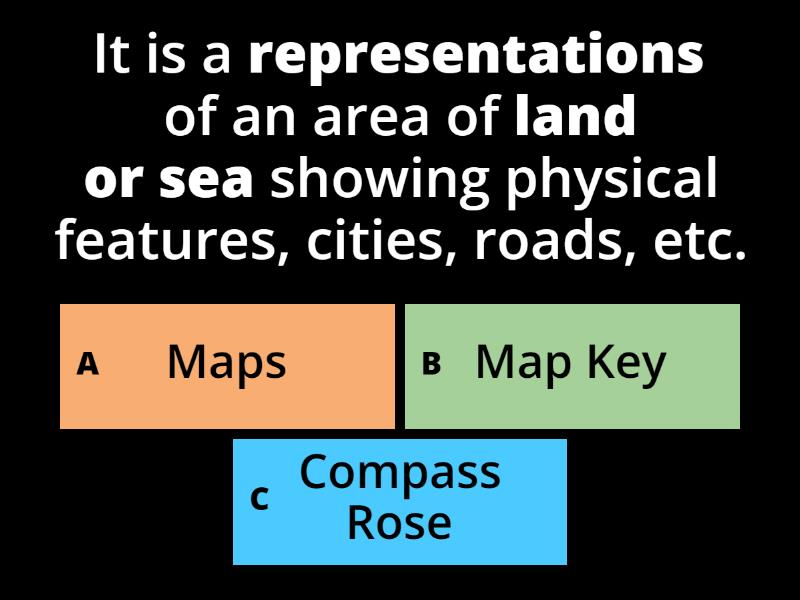 1) It is a representations of an area of land or sea showing physical features, cities, roads, etc. a) Maps b) Map Key c) Compass Rose 2) It is a guide that tell us what the symbols on the map mean. a) Maps b) Map Key c) Compass Rose 3) It shows the directions: North, South, East, and West. a) Maps b) Map Key c) Compass Rose 4) Mike's house is in the _ of the restaurant a) North b) South c) East d) West 5) Sam's house is in the _ of the hotel. a) North b) South c) East d) West 6) Tony's house is in the _ of the bakery. a) North b) South c) East d) West 7) John's house is in the _ of the pet shop. a) North b) South c) East d) West