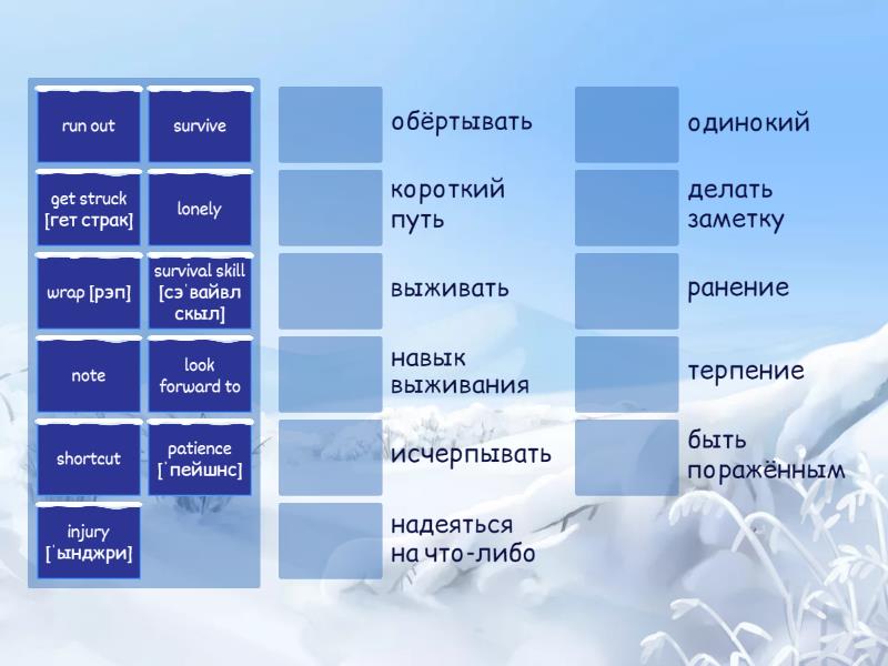 get struck [гет страк] - быть поражённым, injury [ˈынджри] - ранение, lonely - одинокий, look forward to - надеяться на что-либо, note - делать заметку, patience [ˈпейшнс] - терпение, run out  - исчерпывать, wrap [рэп] - обёртывать, survive  - выживать, survival skill [сэˈвайвл скыл] - навык выживания, shortcut  - короткий путь,