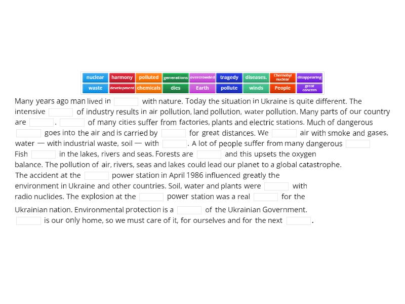 Many years ago man lived in ____ with nature. Today the situation in Ukraine is quite different. The intensive ____ of industry results in air pollution, land pollution, water pollution. Many parts of our country are ____. ____ of many cities suffer from factories, plants and electric stations. Much of dangerous ____ goes into the air and is carried by ____ for great distances. We ____ air with smoke and gases, water — with industrial waste, soil — with ____. A lot of people suffer from many dangerous ____ Fish ____ in the lakes, rivers and seas. Forests are ____ and this upsets the oxygen balance. The pollution of air, rivers, seas and lakes could lead our planet to a global catastrophe. The accident at the ____ power station in April 1986 influenced greatly the environment in Ukraine and other countries. Soil, water and plants were ____ with radio nuclides. The explosion at the ____ power station was a real ____ for the Ukrainian nation. Environmental protection is a ____ of the Ukrainian Government. ____ is our only home, so we must care of it, for ourselves and for the next ____.