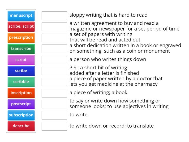 describe - to say or write down how something or someone looks; to use adjectives in writing, inscription - a short dedication written in a book or engraved on something, such as a coin or monument, manuscript - a piece of writing; a book, postscript - P.S.; a short bit of writing added after a letter is finished, prescription - a piece of paper written by a doctor that lets you get medicine at the pharmacy, scribble - sloppy writing that is hard to read, scribe - a person who writes things down, script - a set of papers with writing that will be read and acted out, subscription - a written agreement to buy and read a magazine or newspaper for a set period of time, transcribe - to write down or record; to translate, scribe, script - to write,