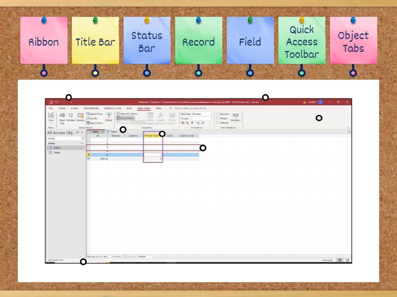 Quick Access Toolbar, Object Tabs, Field, Title Bar, Record, Ribbon, Status Bar.