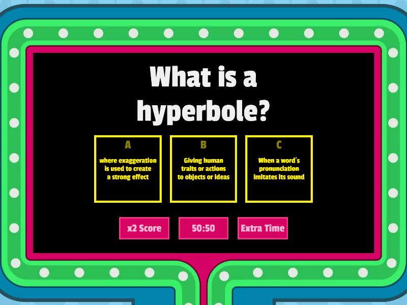 1) What is a hyperbole? a) where exaggeration is used to create a strong effect b) Giving human traits or actions to objects or ideas c) When a word’s pronunciation imitates its sound 2) What is imagery? a) When the first sounds in a word repeat b) the use of language that appeals to the readers 5 senses c) An expression that holds a different meaning to its literal meaning 3) What is a simile? a) DOES NOT use the word “like” or “as” when making a comparison b) always use the word “like” or the word “as” to make the comparison. c) When the first sounds in a word repeat 4) What is a metaphor? a) DOES NOT use the word “like” or “as” when making a comparison b) always use the word “like” or the word “as” to make the comparison. c) An expression that holds a different meaning to its literal meaning 5) What is an idiom? a) Giving human traits or actions to objects or ideas b) the use of language that appeals to the readers 5 senses c) An expression that holds a different meaning to its literal meaning 6) What is alliteration? a) when an object, person, or idea in a text has an additional meaning beyond its literal one b) When a word’s pronunciation imitates its sound c) When the first sounds in a word repeat 7) What is a personification? a) Giving human traits or actions to objects or ideas b) DOES NOT use the word “like” or “as” when making a comparison c) when an object, person, or idea in a text has an additional meaning beyond its literal one 8) What is symbolism? a) where exaggeration is used to create a strong effect b) always use the word “like” or the word “as” to make the comparison c) when an object, person, or idea in a text has an additional meaning beyond its literal one 9) What is a onomatopoeia? a) the use of language that appeals to the readers 5 senses b) When a word’s pronunciation imitates its sound c) Giving human traits or actions to objects or ideas