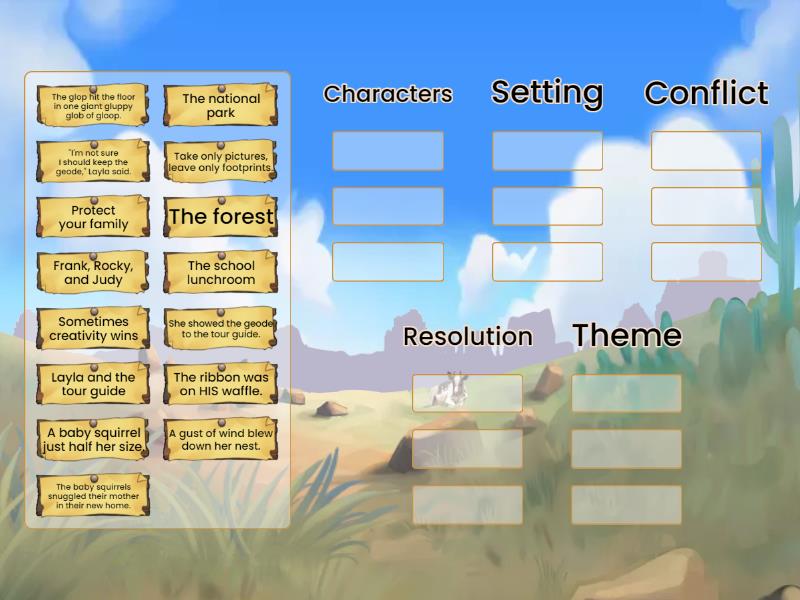Characters: A baby squirrel just half her size., Frank, Rocky, and Judy, Layla and the tour guide, Setting: The school lunchroom, The national park, The forest, Conflict: A gust of wind blew down her nest., "I'm not sure I should keep the geode," Layla said. , The glop hit the floor in one giant gluppy glob of gloop. , Resolution: She showed the geode to the tour guide., The ribbon was on HIS waffle., The baby squirrels snuggled their mother in their new home., Theme: Take only pictures, leave only footprints., Protect your family, Sometimes creativity wins,