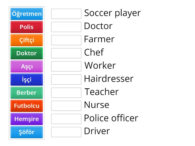 Doktor - Doctor, Öğretmen - Teacher, Aşçı - Chef, Hemşire - Nurse, Polis - Police officer, Futbolcu - Soccer player, Şöför - Driver, Çiftçi - Farmer, Berber - Hairdresser, İşçi - Worker,