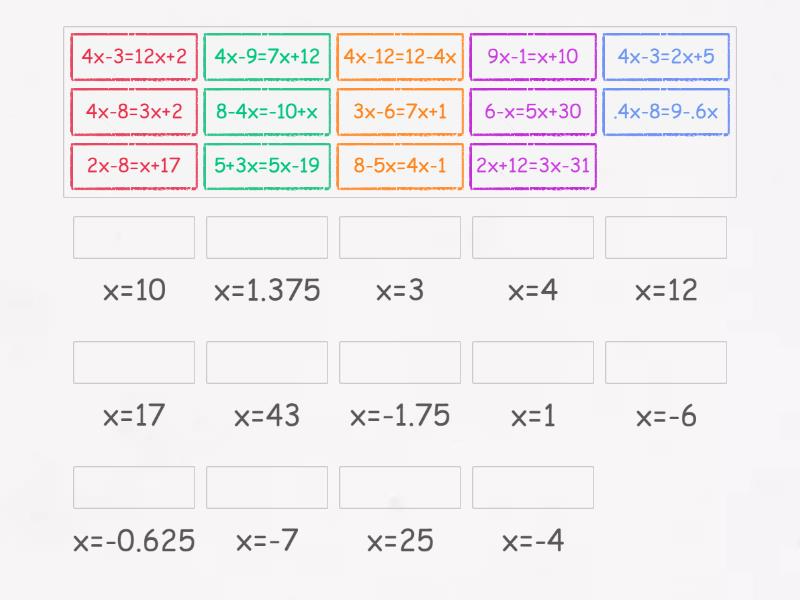 6-x=5x+30 - x=-4, 4x-8=3x+2 - x=10, 8-4x=-10+x - x=-6, 8-5x=4x-1 - x=1, .4x-8=9-.6x - x=17, 4x-3=2x+5 - x=4, 5+3x=5x-19 - x=12, 4x-12=12-4x - x=3, 2x+12=3x-31 - x=43, 2x-8=x+17 - x=25, 4x-9=7x+12 - x=-7, 9x-1=x+10 - x=1.375, 3x-6=7x+1 - x=-1.75, 4x-3=12x+2 - x=-0.625,