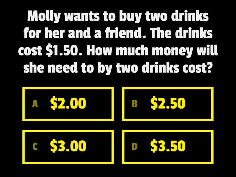 1) Molly wants to buy two drinks for her and a friend. The drinks cost $1.50. How much money will she need to by two drinks cost?   a) $2.00 b) $2.50 c) $3.00 d) $3.50 2) Anna has $4.75 left. Her mom is giving her $3.50 to buy a snack at school. How much money will she have in total?  a) $7.25 b) $8.25 c) $8.00 d) $8.50 3) Nelly has $6.32 and wants to buy a drink for $2.50. How much money will she have left?  a) $2.82 b) $3.00 c) $3.50 d) $3.82 4) Georgia has $3.36 and wants to buy a sticker for $2.25. How much money will she have left after buying the sticker?  a) $1.11 b) $1.15 c) $1.21 d) $1.25 5) Celia wants to have $5.50 by the end of the week to buy snacks at the school dance. So far, she has $2.38. How much more money will she need to get to have $5.50 by the end of the week? a) $2.12 b) $2.75 c) $3.12 d) $3.75