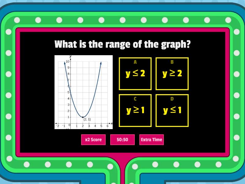 1) What is the range of the graph? a) y ≤ 2 b) y ≥ 2 c) y ≥ 1 d) y ≤ 1 2) What are the coordinates of the vertex of this function? a) (1,4) b) (-2,0) c) (4,0) d) (4,1) 3) What is the domain of this function? a) -1 ≤ x ≤ 3 b) y ≤ -4 c) y ≥ -4 d) All real numbers 4) What is the range of this function? a) -1 ≤ x ≤ 3 b) y ≤ -4 c) y ≥ -4 d) All real numbers 5) What are the coordinates of the vertex of this function? a) (-3,-2) b) (-2,-3) c) (-4.5,0.5) d) -2 6) What are the coordinates of the vertex of this function? a) (0,12) b) (-2,0) c) (16,2) d) (2,16) 7) What is the y-intercept of the graph? a) (2,0) b) (4,0) c) (0,4) d) x = -2 8) What are the coordinates of the point on the coordinate plane? a) (1 ,- 3) b) (3, -1) c) (-3 , 1) d) (-3, -1) 9) What are the coordinate of Point A on the coordinate plane? a) (-2 , 3) b) (2 , 3) c) (3 , 2) d) (-2 , 3) 10) What is the zero of the graph shown on the coordinate plane? a) 0 b) 1 c) 2 d) -1 11) What are the coordinates of Point C? a) (0 , -2) b) (2 , 0) c) (-5 , 3) d) (1 , 4) 12) What are the zeros of the graph? a) -2 and 0 b) -2 and 1 c) 0 and 1 d) -1 and 2 13) What is the x-intercept of the graph? a) 2.5 b) 3 c) 5 d) -3 14) What is the range of the function? a) y ≥ 5 b) y ≤ -2 c) y ≤ 5 d) y < 5 15) What is the slope of the graph? a) b) c) 5 d) 4 16) What is the slope of the graph? a) b) c) - d) 17) What is the slope of the graph? a) 1 b) -1/2 c) -2 d) 2 18) What is the y-intercept of the linear equation y = -5x - 7? a) -5 b) -7 c) 5/7 d) -5/1