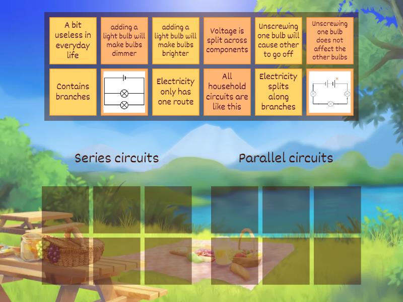 Series circuits: Electricity only has one route, Voltage is split across components, A bit useless in everyday life, adding a light bulb will make bulbs dimmer, , Unscrewing one bulb will cause other to go off, Parallel circuits: Electricity splits along branches, Contains branches, All household circuits are like this, adding a light bulb will make bulbs brighter, , Unscrewing one bulb does not affect the other bulbs,