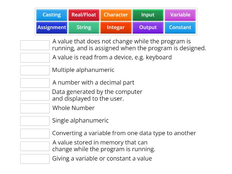 Variable - A value stored in memory that can change while the program is running., Constant - A value that does not change while the program is running, and is assigned when the program is designed., Assignment - Giving a variable or constant a value, Casting - Converting a variable from one data type to another, Input - A value is read from a device, e.g. keyboard, Output - Data generated by the computer and displayed to the user., Integar - Whole Number, Character - Single alphanumeric, Real/Float - A number with a decimal part, String - Multiple alphanumeric,