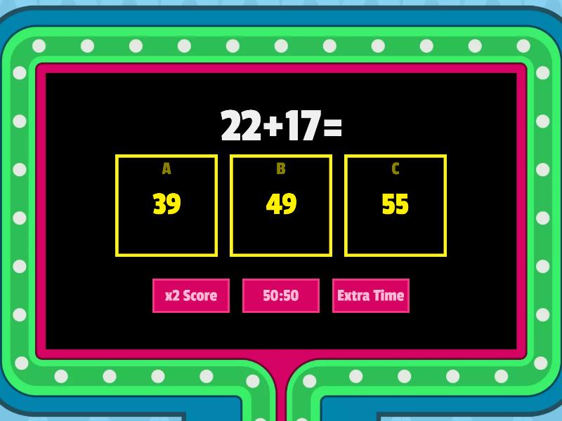 1) 22+17= a) 39 b) 49 c) 55 2) 71+16= a) 97 b) 87 c) 57 3) 45+23= a) 58 b) 28 c) 68 4) 49+6= a) 55 b) 45 c) 56 5) 24+50= a) 76 b) 74 c) 20 6) 55+20= a) 75 b) 26 c) 74 7) 18+30= a) 58 b) 48 c) 56 8) 71+3= a) 76 b) 75 c) 74 9) 48+31 a) 79 b) 69 c) 14 10) 3+85= a) 89 b) 88 c) 87 11) 20+30= a) 50 b) 60 c) 31 12) 70+10 a) 90 b) 70 c) 80 13) 22+2 a) 24 b) 25 c) 20 14) 19+10 a) 0 b) 20 c) 29 15) BONUS- 91+30= a) 121 b) 101 c) 131