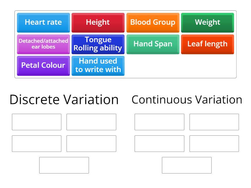 Discrete Variation: Tongue Rolling ability , Petal Colour, Detached/attached ear lobes, Hand used to write with, Blood Group, Continuous Variation: Height, Weight, Hand Span, Heart rate, Leaf length ,