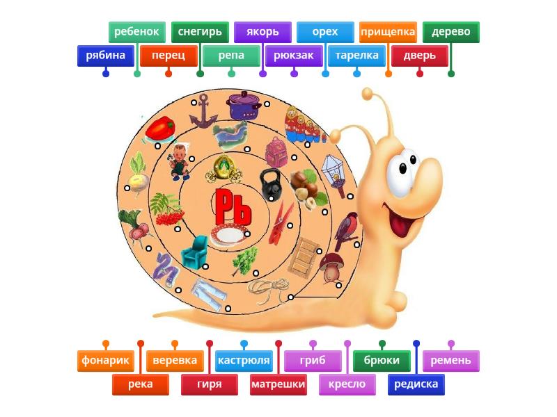 тарелка, гиря, прищепка, дерево, кресло, рябина, ребенок, река, рюкзак, орех, дверь, веревка, брюки, ремень, редиска, репа, перец, якорь, кастрюля, матрешки, фонарик, снегирь, гриб.