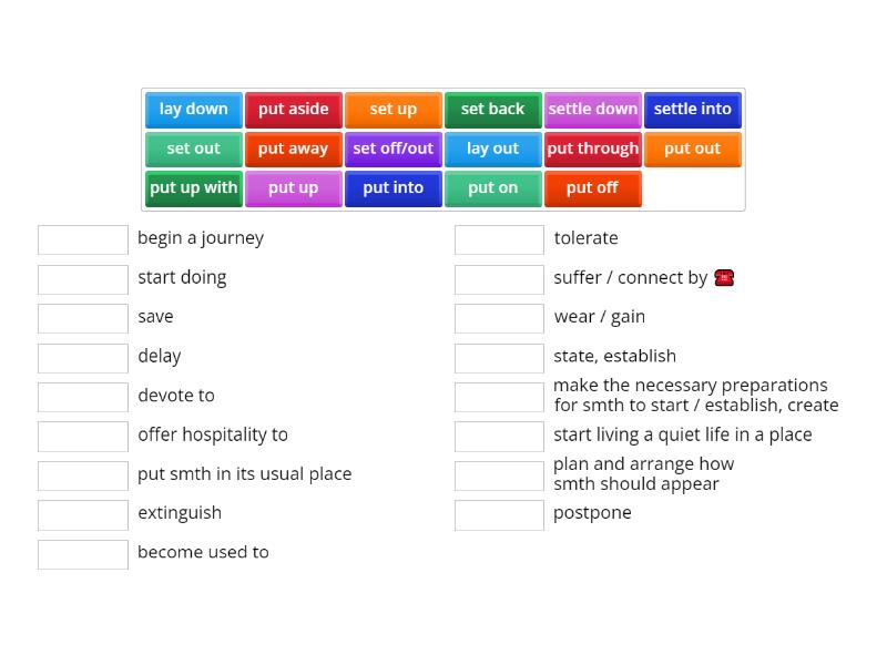 put on - wear / gain, put up with - tolerate, put off - postpone, put through - suffer / connect by ☎️ , put away - put smth in its usual place, put aside - save, put out - extinguish, put up - offer hospitality to, put into - devote to, lay down - state, establish, lay out - plan and arrange how smth should appear, set up - make the necessary preparations for smth to start / establish, create, set off/out - begin a journey, set out - start doing, set back - delay, settle into - become used to, settle down - start living a quiet life in a place,