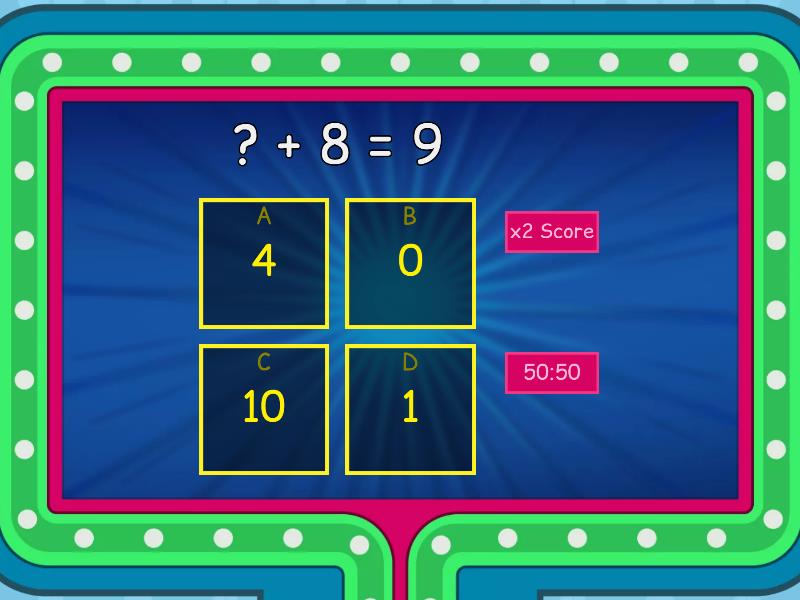 1) ? + 8 = 9 a) 4 b) 0 c) 10 d) 1 2) ? +  5 = 9 a) 0 b) 3 c) 4 d) 9 3) ? + 8 = 9 a) 9 b) 1 c) 10 d) 2 4) 0 + ? = 9 a) 9 b) 2 c) 3 d) 8 5) ? + 2 = 5 a) 3 b) 2 c) 5 d) 9 6) 1 + ? = 1 a) 13 b) 1 c) 0 d) 4 7) ? + 2 = 4 a) 2 b) 0 c) 3 d) 4 8) 6 + ? = 8 a) 4 b) 2 c) 3 d) 1 9) ? + 3 = 6 a) 8 b) 3 c) 4 d) 0 10) ? + 2 = 10 a) 0 b) 8 c) 5 d) 9