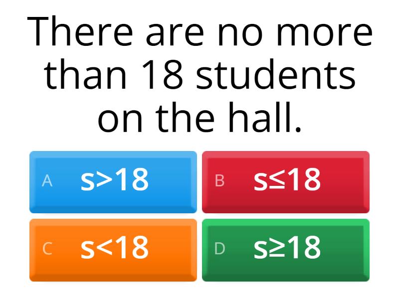 1) There are no more than 18 students on the hall. a) s>18 b) s≤18 c) s<18 d) s≥18 2) There are fewer than 150 children at the playground. a) c<150 b) c≤150 c) c>150 d) c≥150 3) At least 25 cats are on my porch. a) c<25 b) c≤25 c) c>25 d) c≥25 4) Grace has $45 at most in her purse. a) g<45 b) g≤45 c) g>45 d) g≥45 5) My sister plans to sell more than 250 boxes of cookies. a) c>250 b) c≤250 c) c<250 d) c≥250 6) Today's temperature will be at least -4 degrees. a) t < -4 b) t ≤ -4 c) t > -4 d) t ≥ -4 7) If m > 17, which is a possible value for m? a) 12 b) 23 c) 10 d) 7 8)  If s ≤ 35, which is NOT a solution of the inequality? a) 25 b) 42 c) 35 d) 30
