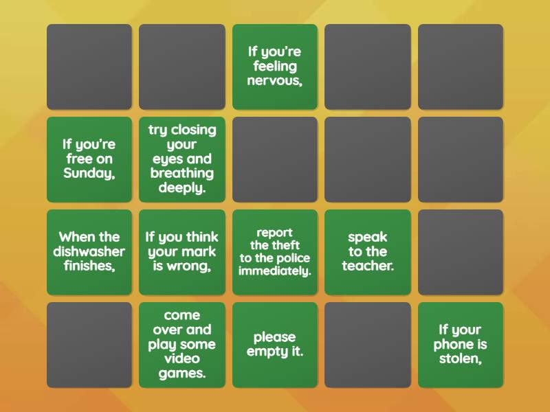If you’re free on Sunday, - come over and play some video games., If you think your mark is wrong, - speak to the teacher., When the dishwasher finishes, - please empty it., If your phone is stolen, - report the theft to the police immediately., If you’re feeling nervous, - try closing your eyes and breathing deeply., When you leave the house, - don’t forget to lock the door., If you take the earlier bus, - you will have more time , When all the exams are over, - you will be able to relax., If you have a pet, - you need to spend lots of time with it., If you ask your friends tomorrow, - they will explain what to do, I'm sure.,