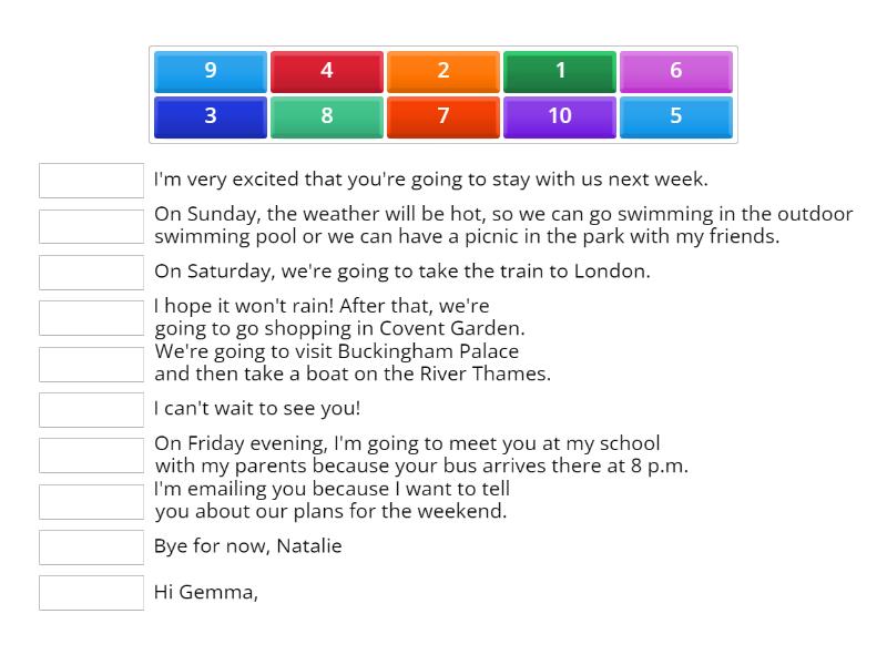 1 - Hi Gemma,, 2 - I'm very excited that you're going to stay with us next week., 3 - I'm emailing you because I want to tell you about our plans for the weekend., 4 - On Friday evening, I'm going to meet you at my school with my parents because your bus arrives there at 8 p.m., 5 - On Saturday, we're going to take the train to London., 6 - We're going to visit Buckingham Palace and then take a boat on the River Thames., 7 - I hope it won't rain! After that, we're going to go shopping in Covent Garden., 8 - On Sunday, the weather will be hot, so we can go swimming in the outdoor swimming pool or we can have a picnic in the park with my friends., 9 - I can't wait to see you!, 10 - Bye for now, Natalie,