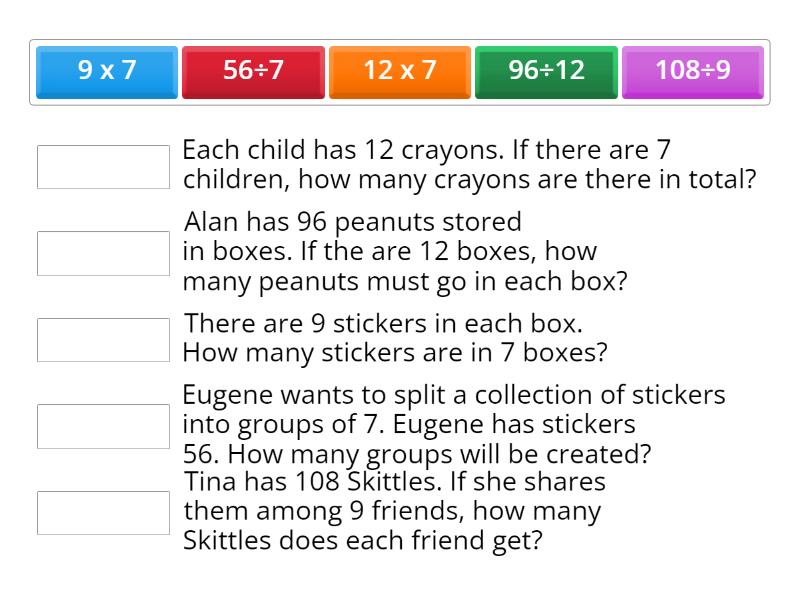 96÷12 - Alan has 96 peanuts stored in boxes. If the are 12 boxes, how many peanuts must go in each box?, 108÷9 - Tina has 108 Skittles. If she shares them among 9 friends, how many Skittles does each friend get?, 56÷7 - Eugene wants to split a collection of stickers into groups of 7. Eugene has stickers 56. How many groups will be created?, 9 x 7 - There are 9 stickers in each box. How many stickers are in 7 boxes?, 12 x 7 - Each child has 12 crayons. If there are 7 children, how many crayons are there in total?,