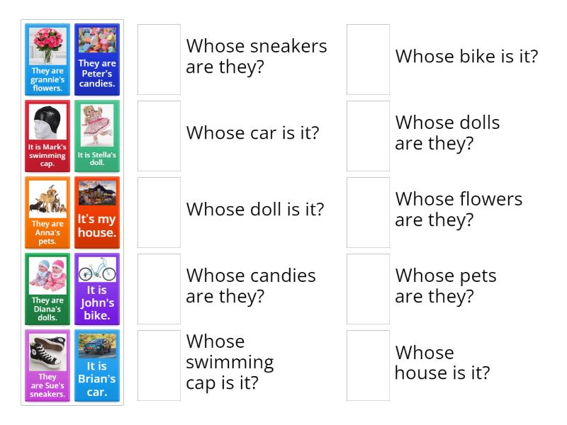 They are Anna's pets. - Whose pets are they?, They are Peter's candies. - Whose candies are they?, They are grannie's flowers. - Whose flowers are they?, It is John's bike. - Whose bike is it?, It is Stella's doll. - Whose doll is it?, It is Mark's swimming cap. - Whose swimming cap is it?, It is Brian’s car. - Whose car is it?, They are Sue’s sneakers. - Whose sneakers are they?, It’s my house. - Whose house is it?, They are Diana’s dolls. - Whose dolls are they?,