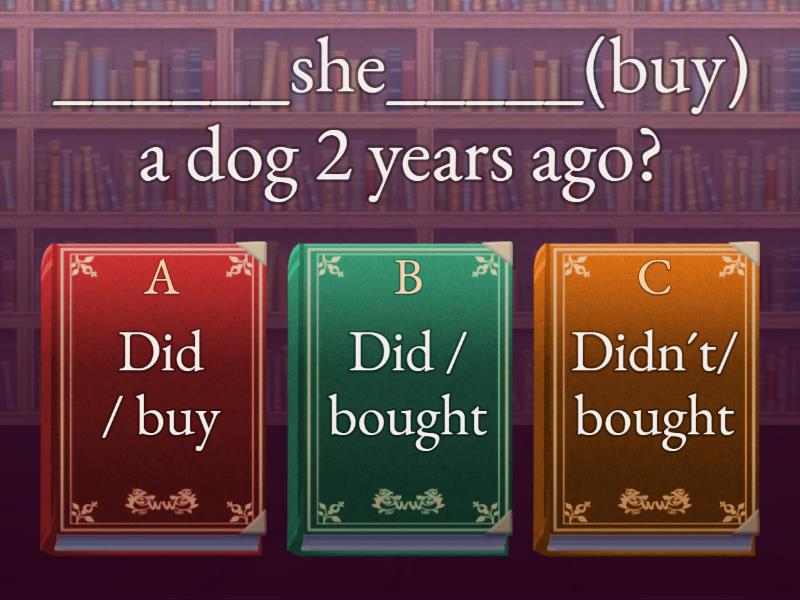 1) ______she_____(buy) a dog 2 years ago? a) Did / buy b) Did / bought c) Didn´t/ bought 2) ____________(go) to the party yesterday? a) Do you go b) Did you go c) Did you went 3) ____________(see) her grandma last weekend? a) Did she saw b) She did see c) Did she see 4) _____Hannah _______ (do) the homework last night? a) Did / did b) Did /  do c) Did / didn´t 5) ________Emma´s mum________ (cook) pancakes yesterday? a) Does/ cook b) Did/ cooked c) Did / cook 6) _________(play) games last week? a) Did we play b) We did play c) Did we played 7) ______________(think) she was right? No, she didn't. She _____________ she was wrong. a) Did she think / thought b) Did think she / thinked c) She thought / thought 8) ___________(study) last year? Yes, I did. a) You studied b) Did you study c) You did study 9) ____________(find) money last month? No, I _____________ any money. I ___________ an umbrella. a) Did you finded / didn't find / finded b) Did you find / didn't find / found c) Did you find / didn't found / found 10) _________________ to the party last night? Yes, she did. a) Does she come b) Did she came c) Did she come 11) ________they _______(travel) to Brazil last night? a) Do / travel b) Did / travel c) Did/ travelled 12) ___________________(have) a party at the weekend? a) Did my friends have b) My friends have c) Did my friends has 13) ________ (buy) a car a month ago? Yes, I _______ a Nissan.   a) You bought / buy b) Did you bought / bought c) Did you buy / bought d) When 14) ____________ to school by bus this morning? No, she didn't. She _______ by car. a) Did she go / goed b) Did she went / went c) Did she go / went 15) _______ yesterday? She went to the grocery store. a) Where did she go b) Did she go c) Where she went 16) ____________ to do that exercise last night? No, I __________ a) You tried / do b) Did you try / didn't c) Did you try / did 17) _________ your finger? When I ______ the tomatoes yesterday. a) How you cut / cutted b) Did you cut / cutted c) How did you cut / cut 18) ________ when the movie began? Yes , I did. It began at 8 p.m. a) Did you see b) Did you saw c) You saw