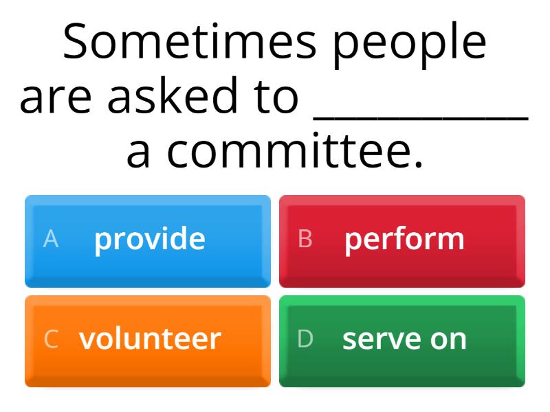 1) Sometimes people are asked to __________ a committee. a) provide b) perform c) volunteer d) serve on 2) Choose all examples of places of worship. a) church b) mosque c) temple d) library e) mall f) synagogue 3) Which three words have similar meanings? a) serve, volunteer, fundraise b) tutor, serve, distribute c) coach, tutor, mentor d) distribute, perform, fundraise 4) A tutor is a teacher who teaches ____________ a) single students or small groups of students. b) classes or large groups of students. c) middle school or high school students only d) adults or university students only. 5) What does someone who fundraises do? a) distribute food b) collect money c) collect food d) distribute money 6) What is the opposite of distribute? a) collect b) hand in c) handle d) give 7) Daniel _______ youth. One of the things he helps them do is set personal goals. a) signs up b) mentors c) tutors d) serves e) coaches 8) some singers __________ for free at hospitals or senior centers. a) fundraise b) perform c) tutor d) coach 9) Which is NOT a common way that people volunteer? a) serve on a committee b) clean parks or roads c) tutor children d) sell cars e) distribute food f) fundraise 10) John does not want to work with lots of people or kids, but he still wants to volunteer. What could he do? a) fundraise b) serve on a committee c) tutor children d) mow the lawn for elderly people