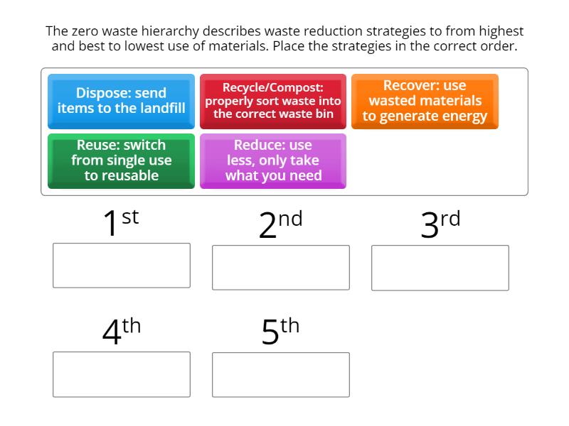 Reduce: use less, only take what you need, Reuse: switch from single use to reusable, Recycle/Compost: properly sort waste into the correct waste bin, Recover: use wasted materials to generate energy, Dispose: send items to the landfill.