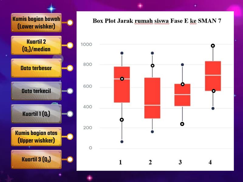 Data terbesar, Kuartil 1 (Q1), Kuartil 3 (Q3), Kuartil 2 (Q2)/median, Data terkecil, Kumis bagian bawah (Lower wishker), Kumis bagian atas (Upper wishker).