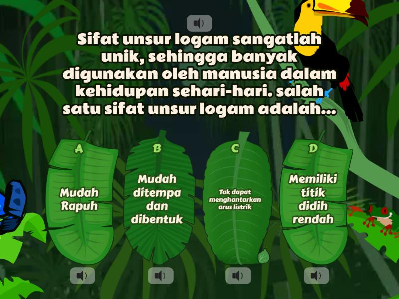 1) Sifat unsur logam sangatlah unik, sehingga banyak digunakan oleh manusia dalam kehidupan sehari-hari. salah satu sifat unsur logam adalah... a) Mudah Rapuh b) Mudah ditempa dan dibentuk c) Tak dapat menghantarkan arus listrik d) Memiliki titik didih rendah 2) Berikut ini yang termasuk sebagai unsur logam yang berwujud cair adalah.... a) Aluminium (Al) b) Emas (Au) c) Air Raksa (Hg) d) Besi (Fe) 3) Sifat-sifat unsur non-logam merupakan kebalikan dari sifat-sifat unsur logam. Unsur nonlogam yang kita temui dapat berwujud padat, cair, maupun gas. Diantara unsur nonlogam di bawah ini yang termasuk ke dalam unsur nonlogam yang berwujud padat adalah... a) Hidrogen (H) b) Karbon (C) c) Oksigen (O) d) Bromin (Br) 4) Unsur ini dapat berubah bentuk atau kembali padat dan tetap pada bentuk setelah perlakuan diberikan karena ikatan antar atom penyusunnya yang sangat kuat merupakan sifat dari unsur.... a) Logam b) Alami c) Buatan d) Nonlogam 5) Unsur non logam dapat dimanfaatkan dalam bentuk unsur murninya, namun ada juga yang dimanfaatkan dalam bentuk senyawanya dengan unsur-unsur lain. Berikut ini yang termasuk unsur non logam yang dapat dimanfaatkan dalam bentuk murninya dalam wujud gas adalah.... a) Helium b) Nitrogen c) Bromin d) Karbon