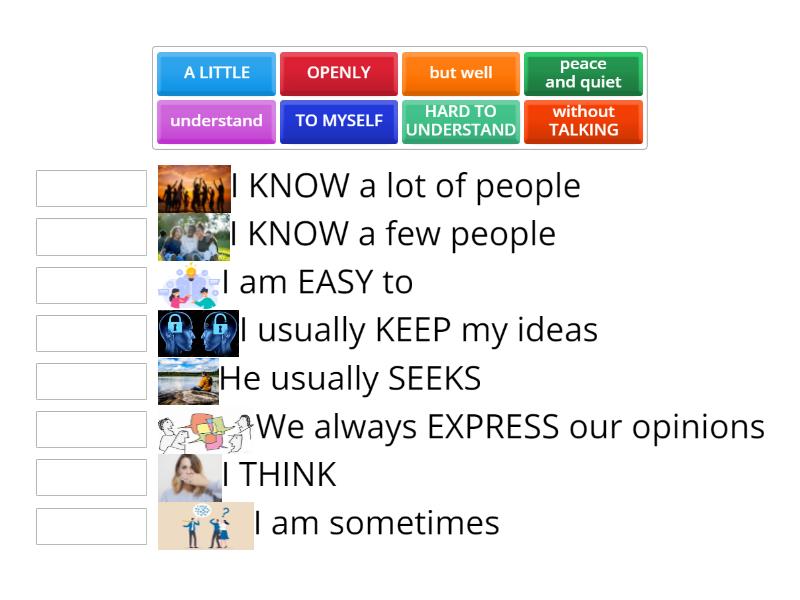 OPENLY - We always EXPRESS our opinions, without TALKING - I THINK , A LITTLE - I KNOW a lot of people , HARD TO UNDERSTAND - I am sometimes , but well - I KNOW a few people, understand - I am EASY to, TO MYSELF - I usually KEEP my ideas, peace and quiet - He usually SEEKS ,