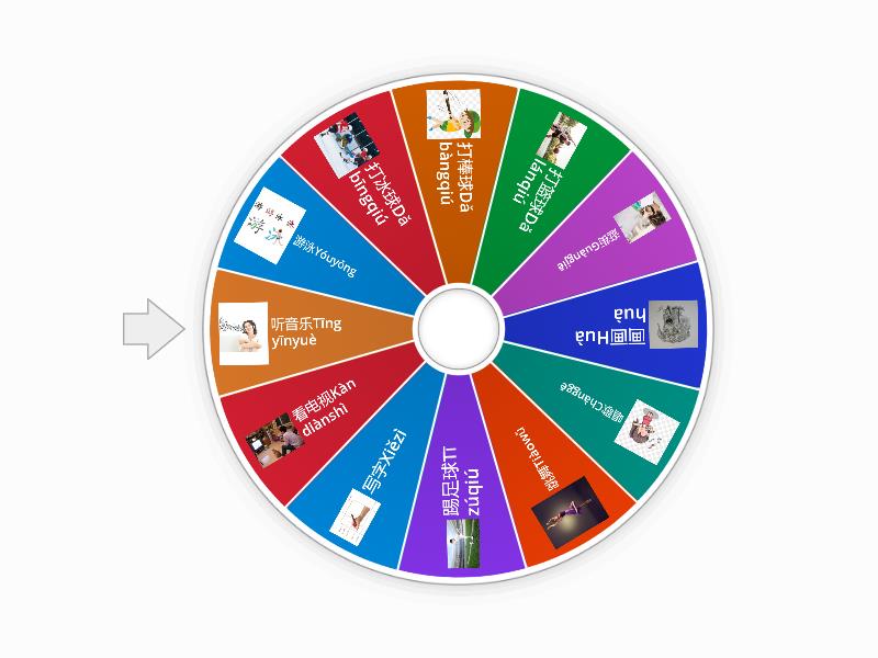 1) 游泳Yóuyǒng 2) 打冰球Dǎ bīngqiú 3) 打棒球Dǎ bàngqiú 4) 打篮球Dǎ lánqiú 5) 逛街Guàngjiē 6) 画画Huà huà 7) 唱歌Chànggē 8) 跳舞Tiàowǔ 9) 踢足球Tī zúqiú 10) 写字Xiězì 11) 看电视Kàn diànshì 12) 听音乐Tīng yīnyuè