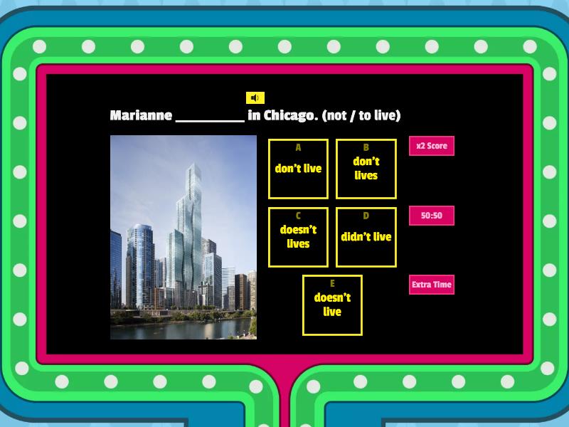 1) Marianne ___________ in Chicago. (not / to live) a) don't live b) don't lives c) doesn't lives d) didn't live e) doesn't live 2) ___________Fred and Tommy ___________ at Yale University? (to study) a) Does / studies b) Does / study c) Do / studies d) Do / study e) did / studied 3) My sisters, Emilia and Tylla, ___________ to eat hamburgers. (not / to like) a) don't like b) doesn't like c) don't likes d) doesn't likes e) didn't like 4) They ___________ Maria's mother very well. (not / to know) a) don't knows b) doesn't know c) don't know d) doesn't knows e) didn't know 5) Blanca ___________ her homework evry day. ( not / to do) a) doesn't does b) doesn't do c) doesn't did d) don't do e) don't does 6) ___________ Phillippe ___________ Russian really well? ( to learn) a) does / learn b) does / learns c) does learnt d) do learn e) did learn 7) Malèna ___________ every day. She hates cooking. (not / to cook) a) did cook b) doesn't cooked c) don't cook d) doesn't cooks e) doesn't cook 8) My dog, Pippin, ___________ too loudly. (to bark) a) bark b) barks c) barking d) barked e) have barked 9) We ___________ to the supermarket once a week. (to go) a) goed b) went c) goes d) go e) going 10) What ___________ you ___________ to be when you finish school? (to be) a) does / want b) do / want c) does / wants d) did / want e) do wants 11) I ___________ poems about life, they are existencialist poems. (to write) a) write b) written c) wrote d) writes e) writing 12) Lucilla ___________ wine one a week with her friends. (to drink)  a) drink b) drinking c) drinks d) drank e) drunk