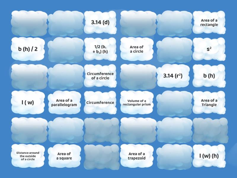 Area of a Triangle - b (h) / 2, Area of a rectangle - l ( w), Area of a square - s2, Area of a trapezoid - 1/2 (b1 + b2) (h), Area of a parallelogram - b (h), Area of a circle - 3.14 (r2), Circumference of a circle - 3.14 (d), Circumference - Distance around the outside of a circle, Volume of a rectangular prism - l (w) (h), Surface area - Area of all the faces of a 3-D figure, Parallelogram - two dimensional figures with two pairs of parallel sides, Isosceles triangle - triangle with two sides that are the same, Scalene triangle - triangle with no equal sides, Obtuse angle - angle larger than 90 degrees, complementary angles - angles who's sum is 90 degrees, supplementary angles - angles who's sum is 180 degrees, volume of a triangular prism - (b)(h)/2 x h, how many days until Easter? - 4,